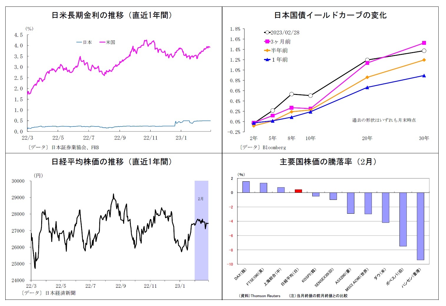 月上旬は、日銀による緩和修正観測が引き続き燻るなか、パウエルFRB議長発言などを受けた早期の米利上げ停止観測に伴って0.5%をやや下回る水準で推移。日銀による共通担保オペ実施の予告も金利上昇の抑制に一定寄与した。しかし、中旬以降はCPIなど予想を上回る経済指標の公表を受けて米利上げ長期化観測が高まり、国内にも金利上昇圧力が波及。これを日銀が指し値オペ等で上昇を抑えた結果、月末にかけて0.5%付近での膠着した推移となった。なお、14日に政府が次期日銀正副総裁人事を国会に提示し、24日から28日にかけて国会で候補者による意見聴取が行われた。意見聴取では各候補から金融緩和の継続方針が示され、急速な正常化に対する懸念は後退したが、緩和修正観測自体は払拭されておらず、長期金利は日銀の許容上限付近に張り付いている。