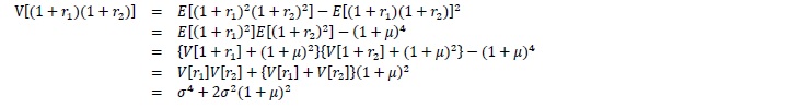 「根拠の一つ」という含みのある書き方をしたのは、算術平均との相性が良い単利は二つの確率的な値を取る変数を足し合わせた値の分散で良いが、価値(初期投資額と合計利益の和)が毎年のリターンに1を加えた値の掛け算で決まる複利の場合の根拠としては不十分だからである1。