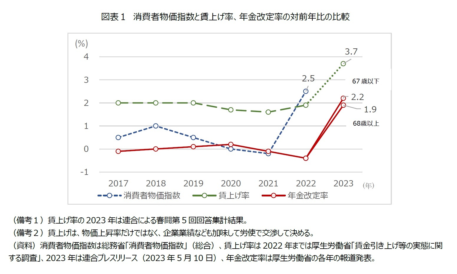 3 中嶋邦夫(2023)「2023年度の年金額(確定値)は、67歳までは2.2%増、68歳からは1.9%増だが、実質的には目減り-年金額改定の仕組み・確定値・注目ポイント」(基礎研レポート)