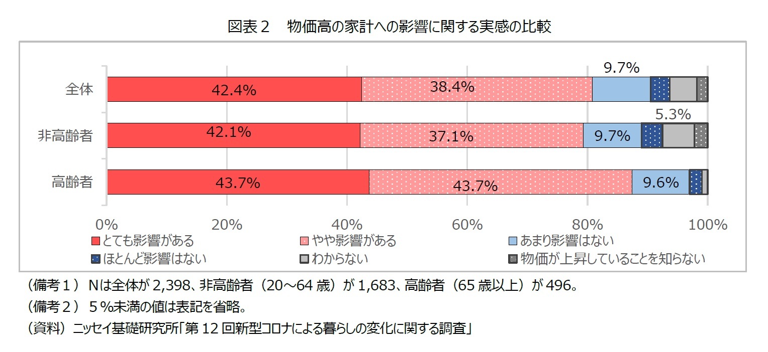 そこで本稿では改めて、物価高の高齢者への影響の大きさや意識をみるために、ニッセイ基礎研究所が今年3月29~31日に20~74歳の男女2,398人を対象に実施したインターネット調査「第12回新型コロナによる暮らしの変化に関する調査」の結果を基に状況をまとめる。