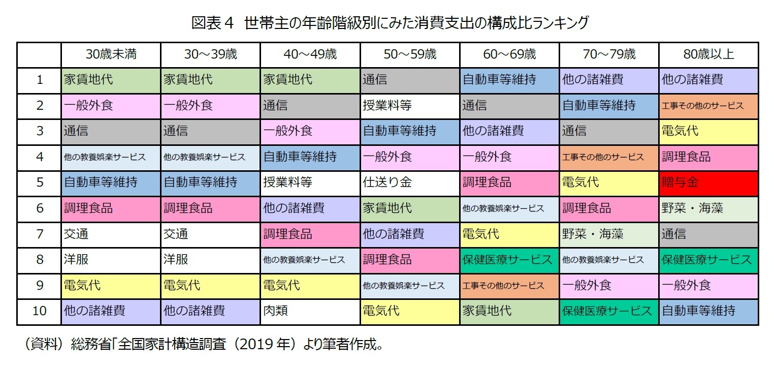 図表3に戻ると、高齢者が物価高を感じている項目の3位は「ガソリン代」(57.3%)である。支出割合ランキング(図表4)でも、ガソリン代を含む「自動車等維持費」は「60~69歳」「70~79歳」では1位、2位と順位が高く、高齢者の家計への影響が大きいことが分かる。コロナ禍以降、高齢者は公共交通を避けてマイカーを利用することが増えた影響もあると考えられる4。