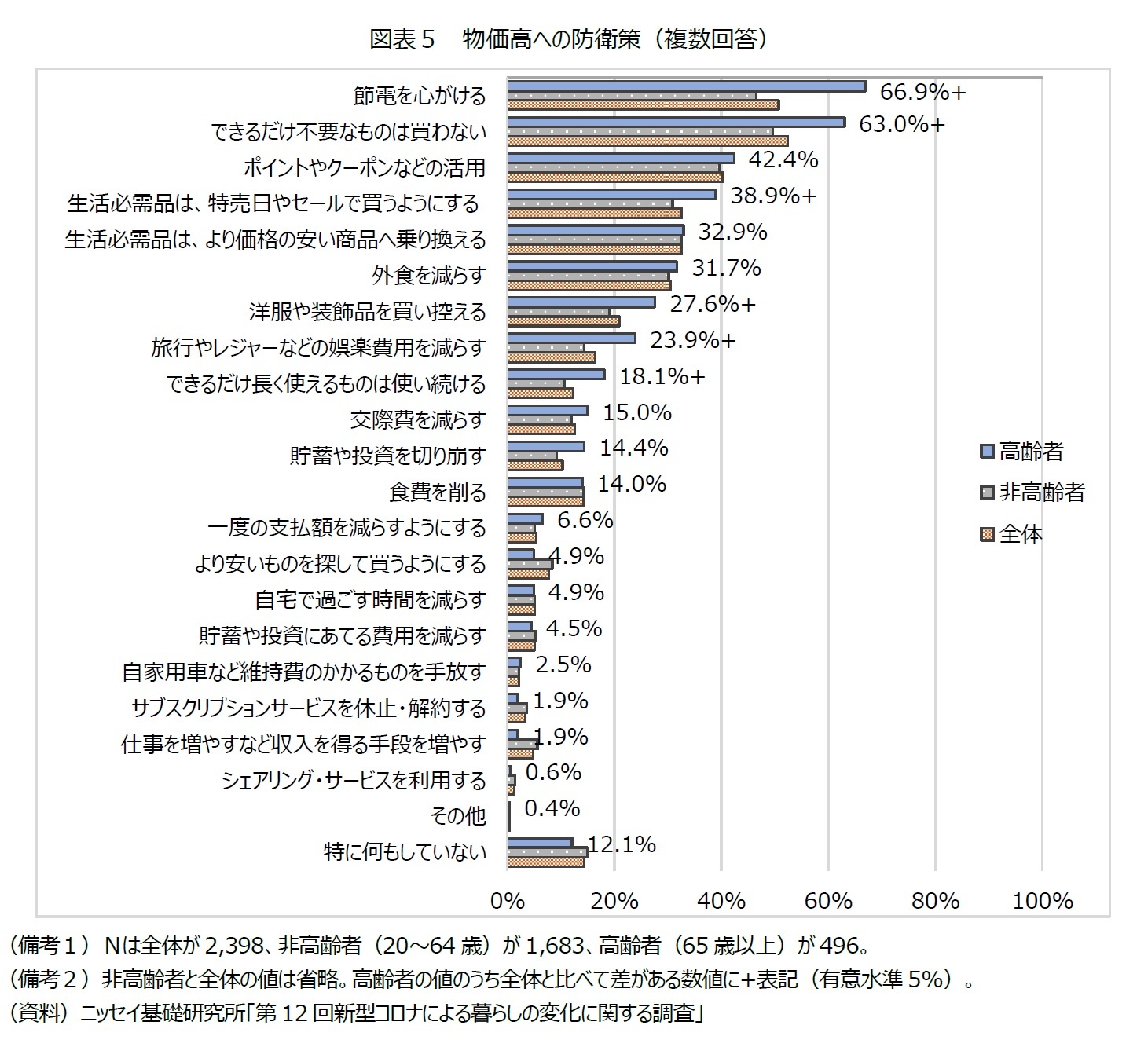 次に、物価高への防衛策について、複数回答方式で聞いた結果が図表5である。最も大きかったのは「節電を心がける」(66.9%)で、全体(50.7%)より有意に高かった。すぐに取り組みやすい手段であることや、2-2|でみた、家計への影響の大きさの裏返しだと考えられる。2位は「できるだけ不要なものは買わない」(63.0%)で、全体(52.4%)よりも有意に高かった。その他にも、「外食を減らす」(31.7%)、「洋服や装飾品を買い控える」(27.6%)、「旅行やレジャーなどの娯楽費用を減らす」(23.9%)なども全体より有意に高い数値となっており、高齢者には、ぜいたく品はできるだけ買い控える動きが強いことが分かる。生活必需品についても「特売日やセールで買うようにする」が全体より大きく、割安に入手するよう努めていることが分かる。
