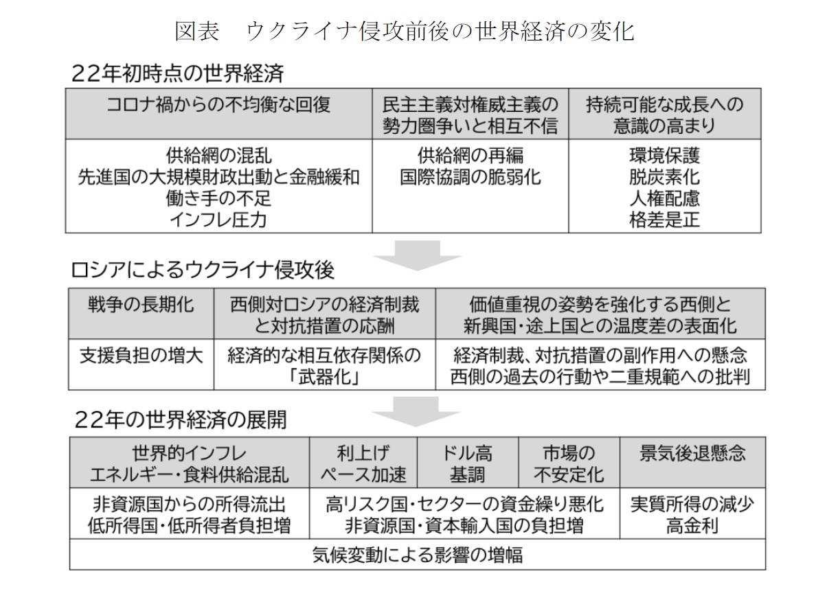 世界経済は減速した。国際通貨基金(IMF)は、23年4月の「世界経済見通し」で、ウクライナの22年の実質GDPは30.3%減、ロシアは同2.1%減としている。米国は同2.1%、ユーロ圏は同3.5%だったが、米国では高速利上げが行われたことによる景気後退と金融不安懸念が燻っている。欧州は手厚いエネルギー危機対策と暖冬の恩恵で、22年10~12月期、23年1~3月期は2四半期連続のマイナス成長となったが、落ち込み幅は小幅に留まった。新興国・途上国、いわゆるグローバルサウスの殆どの国は戦争や制裁に直接関わっていないが、世界的なインフレ、金融環境の急激な変化からの圧力を受けている。とりわけ食料やエネルギーを輸入に頼り、資本流入を必要とする国々の状況は厳しさを増している。