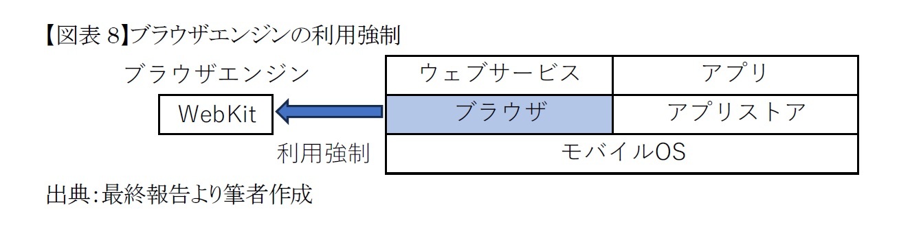 そして最終報告は一定規模以上のOSを提供する事業者が、ブラウザを提供するサードパーティに対して、自らのブラウザエンジンの利用を義務付けることを禁止する規律を導入すべきであるとする。また、一定規模以上のOSを提供する事業者は、(ブラウザ以外のアプリを含め)全てのアプリに対して、自らのブラウザエンジンの利用を義務付けることを禁止する規律を導入すべきであると結論付けた21。