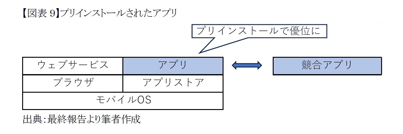 (最終報告の骨子)Googleは、一定のOEM(Original Equipment Manufacturing。Androidのブランドで生産を委託すること)やキャリアとの間でライセンス契約等を締結し、多大な広告収入等を原資とした経済的誘引効果などにより、スマートフォンメーカーがOEMを選択すること等を通じて、ブラウザや検索エンジンをはじめとする自社(Google)のサービスをプリインストール又はデフォルト設定している。また、Apple(OEMを行っていない:筆者注)は、Safariをはじめとする自社のアプリをプリインストールし、また、デフォルト設定するほか、Googleとの間の収益配分を伴う契約によってiPhoneのデフォルト検索エンジンにGoogle検索を採用している。プリインストールやデフォルト設定されたサービス等は、ユーザーに現状維持バイアスが働き、それぞれ最もよく利用される傾向にあるため、競争上優位となり、また、それによって、ユーザーにとっては、自律的な意思決定や選択の機会が損なわれる状況となっている(図表9)。