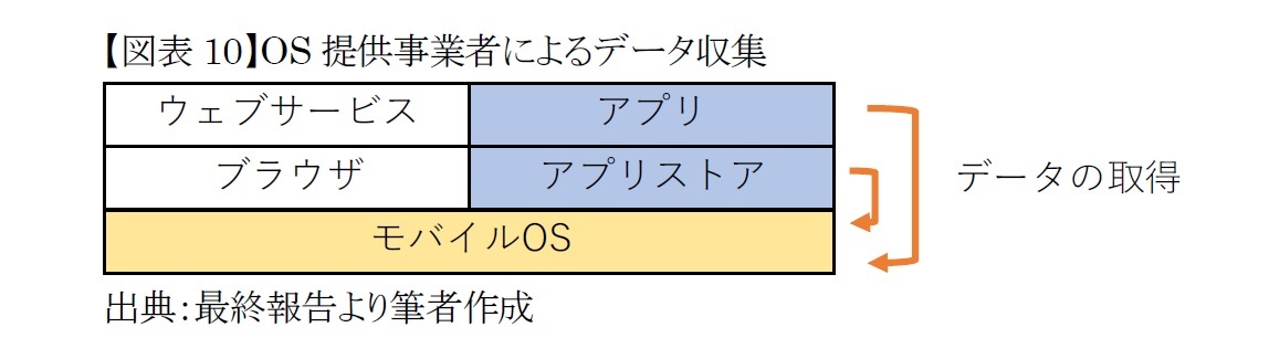 最終報告は、以上から、一定規模以上のOSを提供する事業者、一定規模以上のアプリストアを提供する事業者、一定規模以上のブラウザを提供する事業者に対し、当該OS、ブラウザ、アプリストアをサードパーティがサービス提供に利用した際に得られた公に入手できない当該サービスに関係するデータを、当該サードパーティと競合するサービスの提供において使用することを禁止する規律を導入すべきであると結論付けた28。