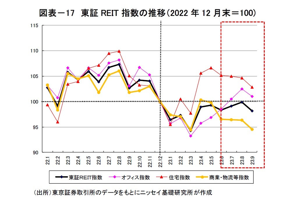今年に入り、Jリート市場と株式市場のパフォーマンス格差が一段と拡大している。年初からの東証REIT指数の下落率は▲1.8%で、コロナ禍の影響を受けた2020年以降では▲13.3%下落し、同期間のTOPIXの上昇(2023年+22.8%、2020年以降+35.0%)を大幅に下回っている(9月末時点)。