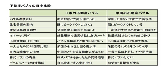 日本との類似点としては、(1)バブル度合いの深刻さ、(2)住宅需要のピークアウト、(3)不動産デベロッパーの相次ぐ経営破綻などがある。一方、相違点としては、(1)住宅価格変動の地域間格差、(2)マネーサプライの動き、(3)金融機関が抱える不良債権額、(4)その他(一人当たりGDPのレベル、有望な輸出先の有無、株式バブルの有無、不動産デベロッパーの負債構成)などがある。