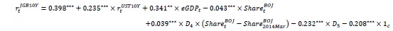 2 「「量的・質的金融緩和」導入以降の経済・物価動向と政策効果についての総括的な検証【背景説明】」(P.48)のモデルで、本稿の記法を用いると、次式のようになる。日本銀行のモデルでは、実質GDP成長率予想にコンセンサス・フォーキャストを使用しており、係数に差異が生じている。なお、*は1%有意、**は5%有意であることを示す。