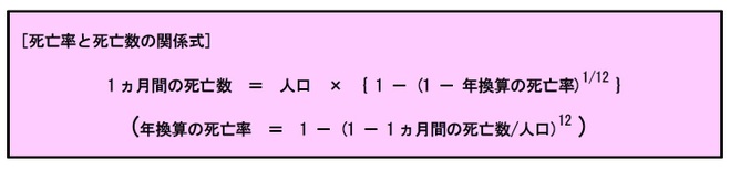 そこで、この年換算の死亡率を用いて、ある月の死亡数を計算する際には、次の関係式の通り、死亡率を調整したうえで人口を掛け算する必要がある。