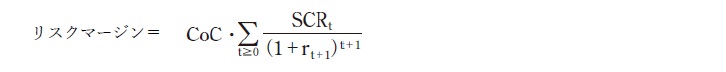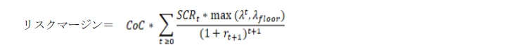 ここで、CoCは資本コスト率(4%)、rt+1 は(t+1)年における基本リスクフリーレート、SCRtは参照会社に対して算出されるt年のSCR、λはリスク漸減ファクターで0.975、λfloor はλのフロアー(下限)で25%に設定される。