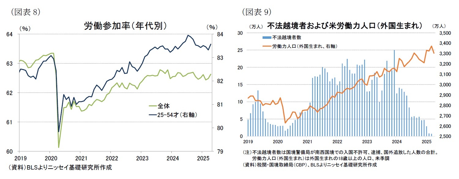 労働供給を示す労働参加率は25年4月が62.6%とコロナ禍前の63.3%を下回る状況が続いている(図表8)。これは主に高齢化の進展などもあって55歳以上の回復が遅れているためだ。一方、働き盛りのプライムエイジ(25-54歳)では83.6%と24年7月の83.9%からは小幅低下したものの、コロナ禍前の水準(83.0%)を上回り02年5月以来の水準を維持している。プライムエイジの回復は不法移民の流入も含めた外国生まれの労働力人口の増加が指摘されている。