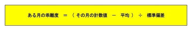 ある1つの項目に、注目する。この項目について、ある月の乖離度を求めることにしよう。そのためには、その月の計数値から、参照期間中の平均を引き算する。その引き算の結果を、参照期間中の標準偏差で割り算する。このようにすることで、その月の計数値が、標準偏差の何倍くらい、平均から乖離しているかという、乖離度が計算できる。