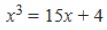 という方程式を例に挙げた。この方程式はx=4 を解に持っているが、カルダノの公式によれば、