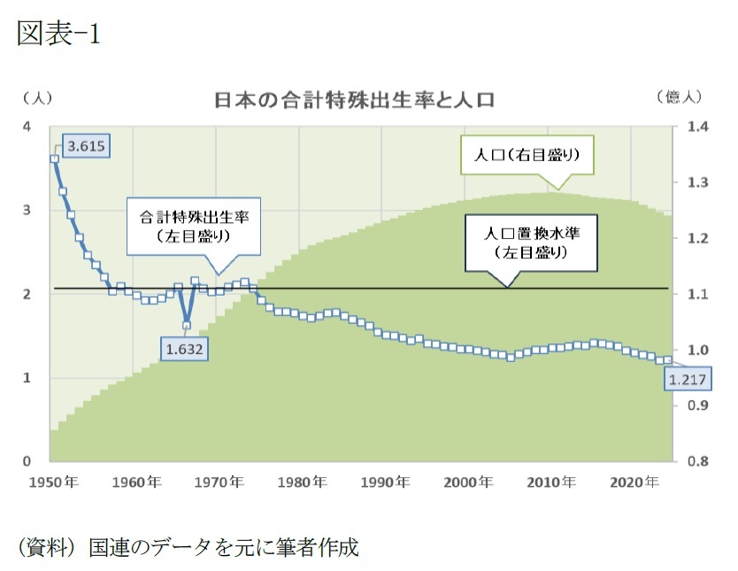これまでの経緯を簡単に振り返ってみると、戦後の第一次ベビーブーム(1947~49年)・第二次ベビーブーム(1971~74年)を経て、1970年代後半から住宅や教育コストの増大、育児と仕事の両立困難性、非正規雇用の増加、「子は少なくても質を高く育てる」と考える家族観の主流化などから、非婚化・晩婚化・晩産化が徐々に進展、日本の合計特殊出生率は下がっていった。そして1990年代に入ると、毎年のように過去最低を更新するようになったため危機感が強まり、1994年には「エンゼルプラン」、1999年には「新エンゼルプラン」と少子化を食い止めるための対策が本格化していった。その後、2010年前後には第二次ベビーブーム世代(団塊ジュニア)が出産のラストチャンス期を迎えたのに加えて、リーマンショック後の景気回復や子ども手当(現在の児童手当)など経済的な育児支援による後押しにより、日本の合計特殊出生率は反転上昇した。但し、それも一時的なものにとどまり、再びじりじりと低下している。他方、日本の人口は、合計特殊出生率が人口置換水準を下回った後もしばらくは、栄養、衛生、医療などの改善により増加を続けていたが、2010年をピークに減少に転じている。