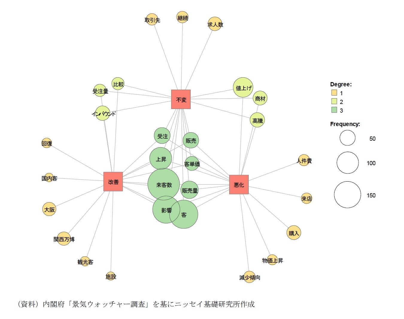 下図は、景気ウォッチャー調査の「景気判断理由集(現状)」のコメントをもとに計量テキスト分析1を行い、共起ネットワーク2を作成したものである。景況感が改善したと判断した回答者のコメントには、大阪、関西万博、観光客、回復といった単語が多く含まれていることが読み取れる。