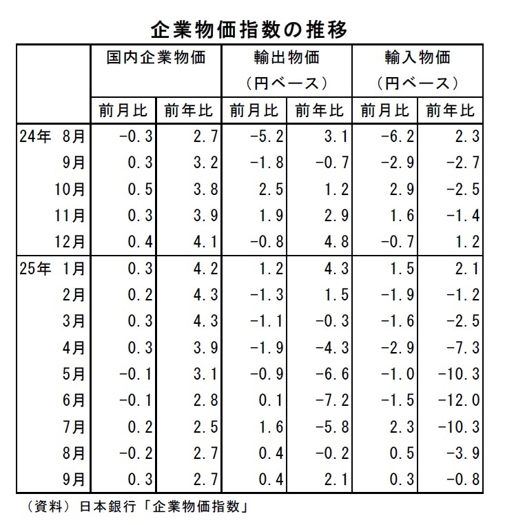 企業物価指数2025年9月~国内企業物価の上昇率は前年比2.7%、先行きは鈍化予想~ -