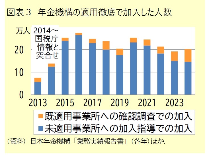 制度改正で対象が拡大しても、実際に加入できなければ厚生年金を受け取れない。厚生年金の加入は原則として事業主が自主的に届け出るため、基準を満たしていても、適用が漏れる事業所や従業員が発生しうる。これを減らす取り組みが、日本年金機構における厚生年金の適用徹底である。