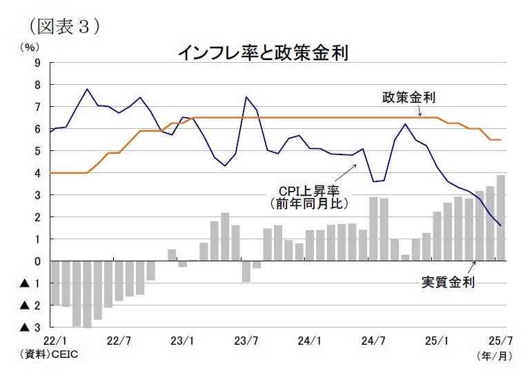 まず食品は前年同月比▲2.3%と、前月の同▲0.7%からマイナス幅が拡大した(図表2)。食品のうち野菜が同▲21.4%、豆類が同▲15.3%となり、それぞれ大幅な価格下落が続いており、また香辛料(同▲3.1%)の減少も続いた。このほか、国際価格の緩和により穀物製品(同2.1%)や牛乳・乳製品(同2.5%)、加工食品(同4.1%)が鈍化した。他方、油脂(同18.3%)と果物(同9.9%)は高い伸びが続いたほか、肉・魚(同+2.1%)が3か月連続で加速した。なお油脂は輸入比率が高く、昨年9月の食用油の関税引き上げや国際的な価格上昇の影響を受けて高い伸びが続いている。