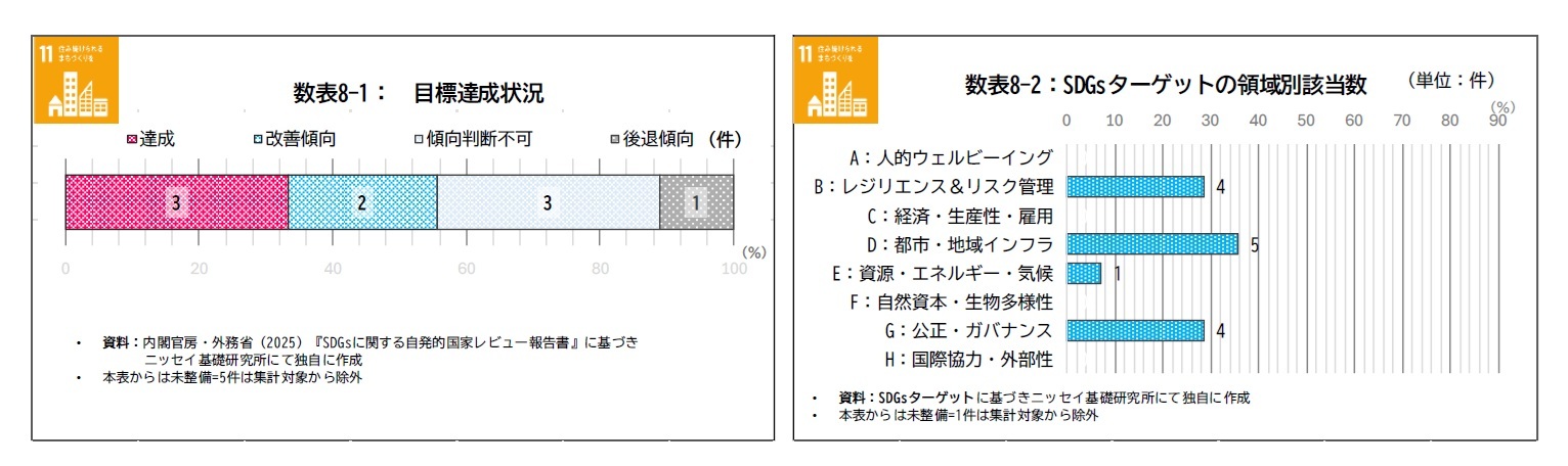 VNR報告書の達成度評価によれば、達成3項目・改善2項目・後退1項目となり、着実な前進が見られる(数表8-1)。内訳は、「レジリエンス&リスク管理(防災・公衆衛生危機等)」領域(達成2項目、改善1項目、後退1項目)、「資源・エネルギー・気候」領域(達成1項目)、「都市・地域インフラ」領域(改善項目)である。後退は「災害による死者・行方不明者(11.5.1)」が該当する。