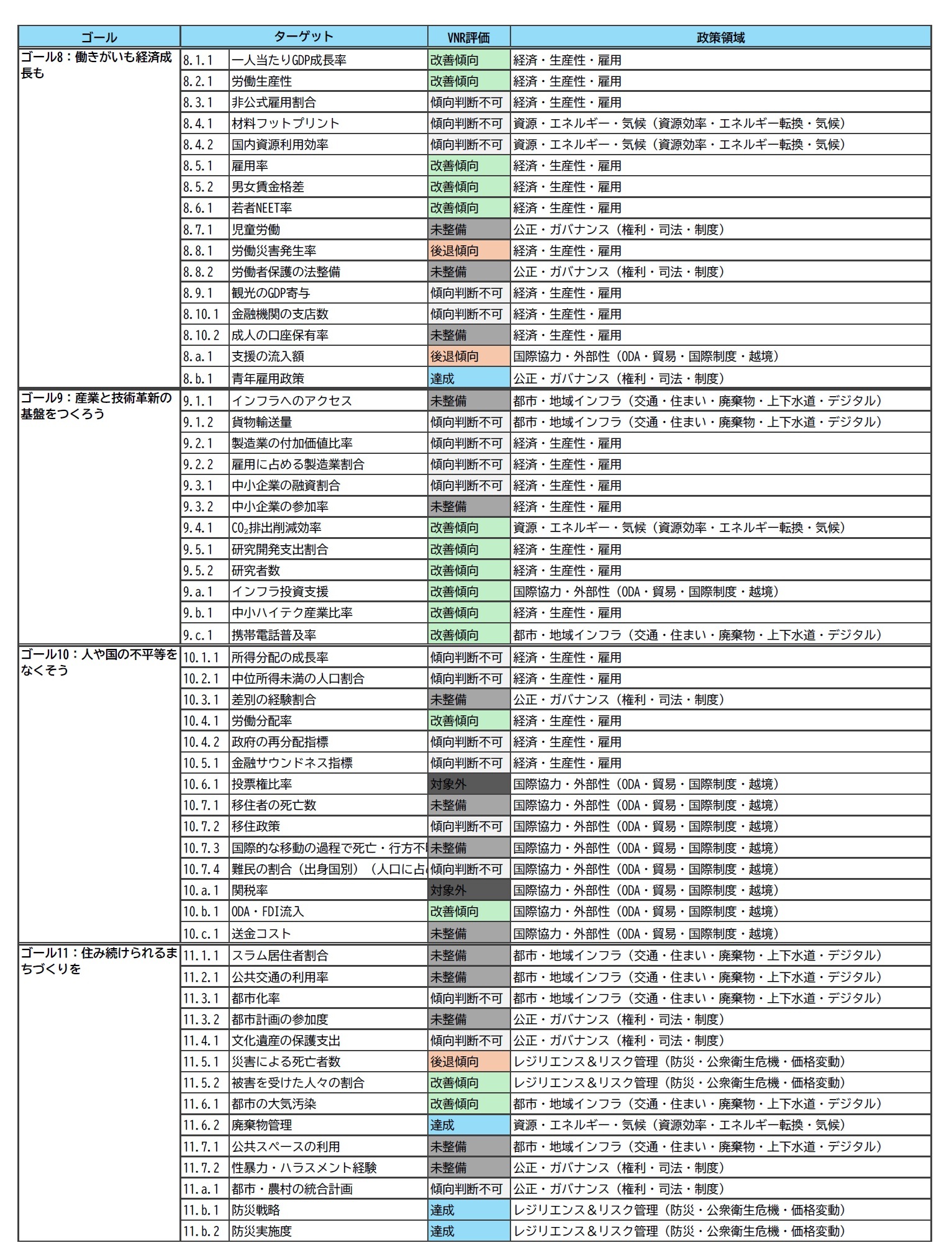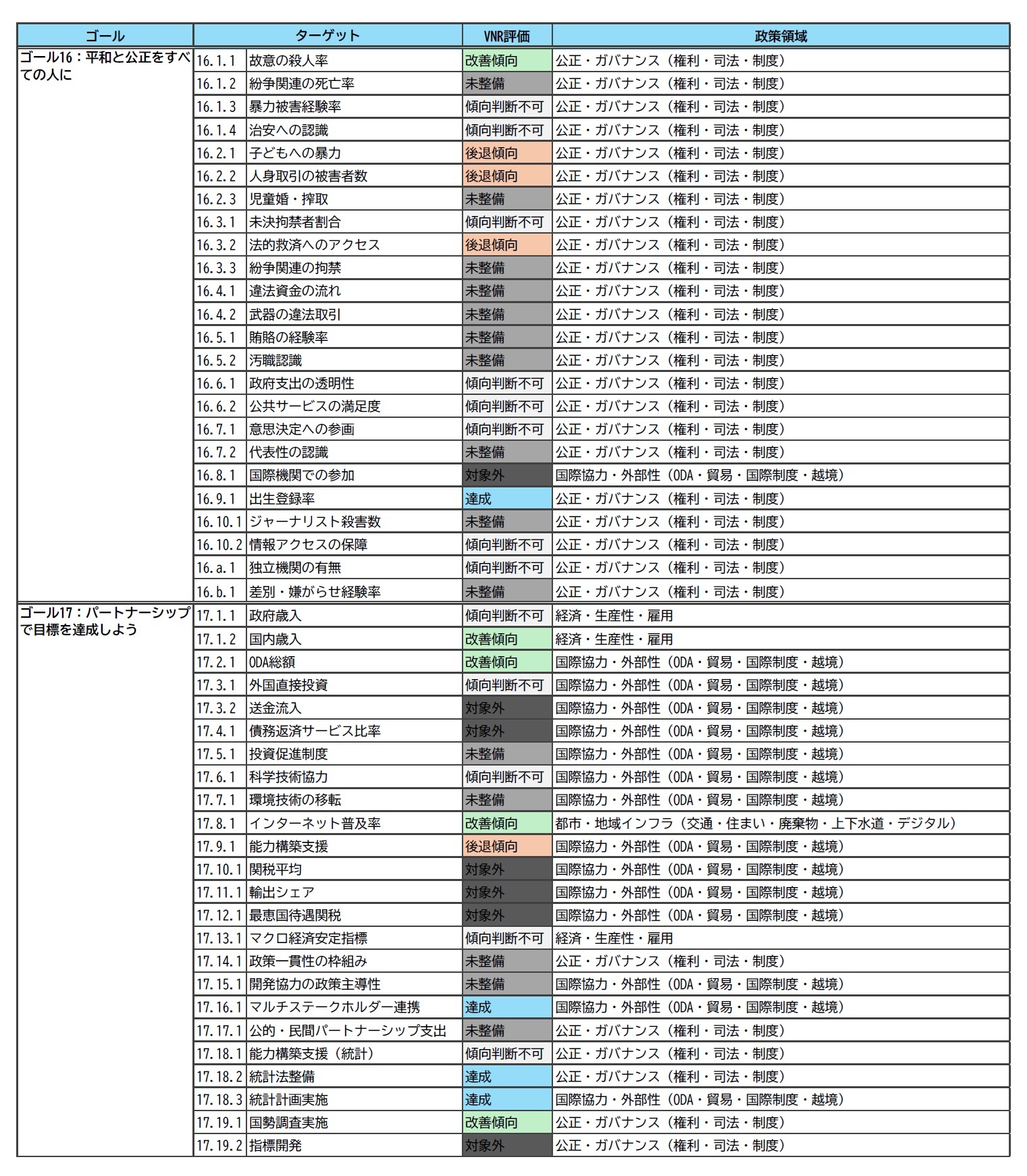 ここまでは、VNR(自発的国家レビュー)報告書におけるSDGsゴールの現状評価と背景・要因を概観した。SDGsは法的拘束力を持たないソフト・ガバナンスの仕組みである。その故、VNRを通じたフォローアップは、国際的なモニタリング体制に日本の状況を接続する重要な活動となる。さらに、国・地方間の統合的なガバナンスの強化12や、官民をまたいだ分野横断的な連携の構築、さらには相乗効果の最大化とトレードオフの最小化に向けた有効な機会にも繋がる。