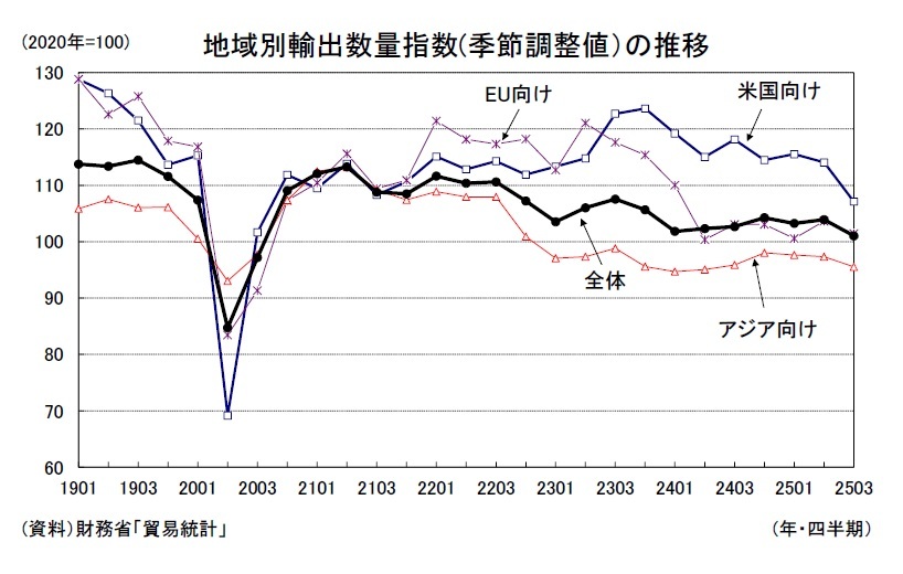 25年9月の輸出数量指数を地域別に見ると、米国向けが前年比▲13.5%(8月:同▲12.0%)、EU向けが前年比▲0.2%(8月:同0.1%)、アジア向けが前年比3.1%(8月:同▲4.7%)、うち中国向けが前年比4.2%(8月:同▲12.4%)となった。