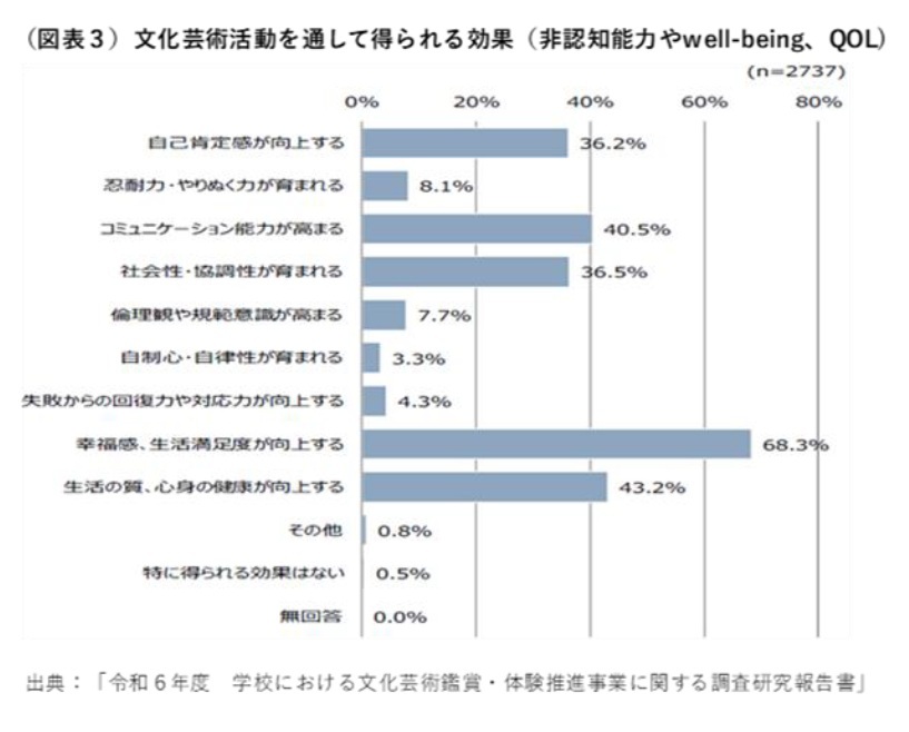 先ず、文化芸術への関心に関する効果について尋ねたところ、「文化芸術への親しみが醸成される」(87.1%)との回答が最も多く、続いて「より豊かな創造性や感性が生まれる」(82.5%)、「芸術科目への理解が深まる」(61.0%)、「日本の文化を知り、国や地域に対する愛着を持つようになる」(32.3%)の結果だった。また、文化芸術活動を通して得られる効果として、非認知能力やwell-being、QOLに関する効果について尋ねたところ、「幸福感、生活満足度が向上する」(68.3%)との回答が最も多く、続いて「生活の質、心身の健康が向上する」(43.2%)、「コミュニケーション能力が高まる」(40.5%)の結果だった(図表3)。