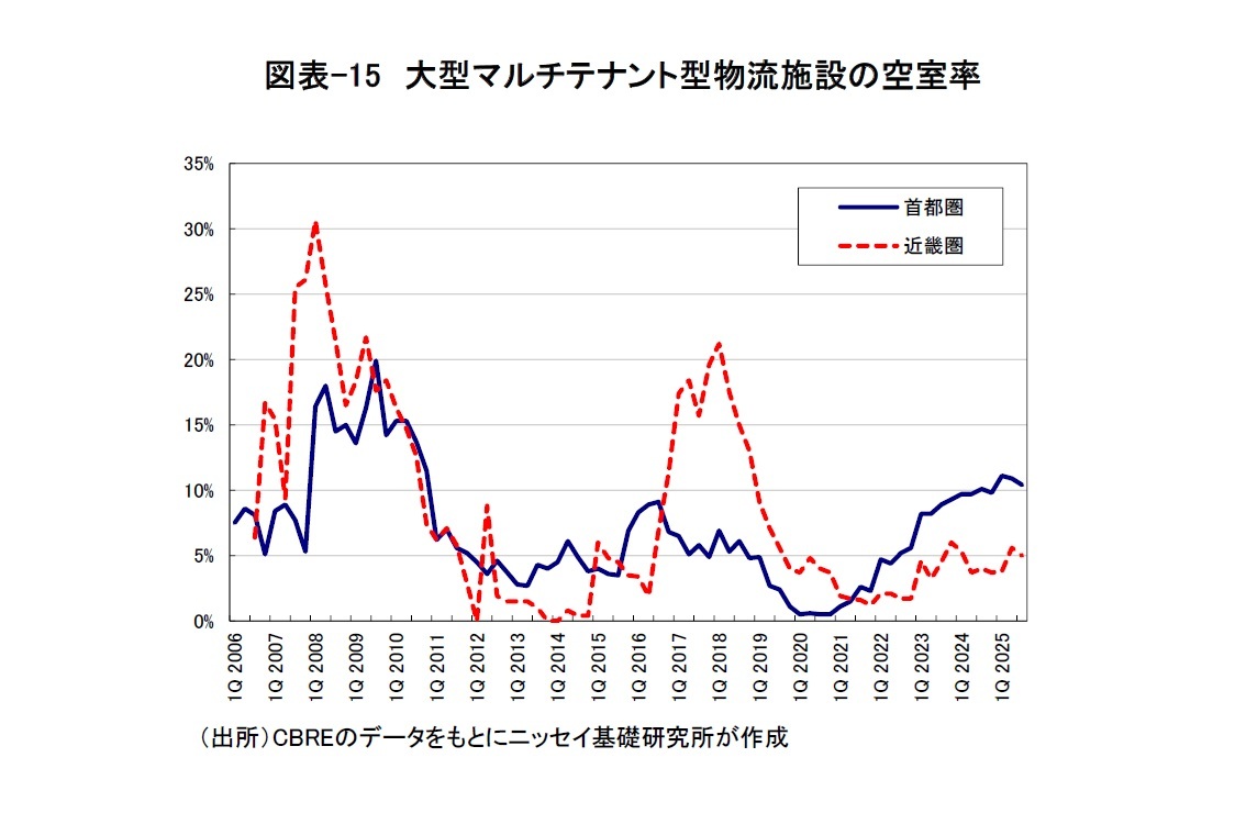 物流賃貸市場は、首都圏では外縁部を中心に空室率が高止まりしている。シービーアールイー(CBRE)によると、2025年第3四半期の首都圏における大型マルチテナント型物流施設の空室率は10.4%(前期比▲0.5ポイント)となった(図表-15)。今期の新規供給物件(3棟・11.8万坪)の竣工時稼働率は5割弱にとどまり、空室率は3四半期連続で10%を上回った。もっとも、今後の新規供給は外環道エリアで増加するものの、圏央道エリアでは減少するため、空室率は緩やかに低下する見通しとのことである。一方、近畿圏の空室率は5.0%(前期比▲0.6ポイント)に低下した。今期の新規供給は3四半期連続で10万坪を超える11.3万坪となったが、新規需要は過去最大の12.2万坪に達し、良好な需給バランスを維持している。
