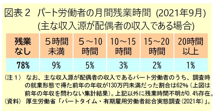 3|今後の課題:労使は第3号被保険者の縮小と将来的な廃止等を要望これらの変更は、「130万円の壁」の引上げとまでは言えないものの、残業代等が判定の際に考慮されないため、第3号被保険者が「130万円の壁」を気にして残業を控えることに対しては、一定の抑制効果を期待できる。図表2のように残業を行っているパート労働者は限られるが、変更されなかった場合と比べれば、人手不足の中で安価な労働力の確保が可能になる点や物価上昇下で安価な商品提供が可能になる点で、該当する第3号被保険者だけでなく、社会にとってもメリットとなりうる。