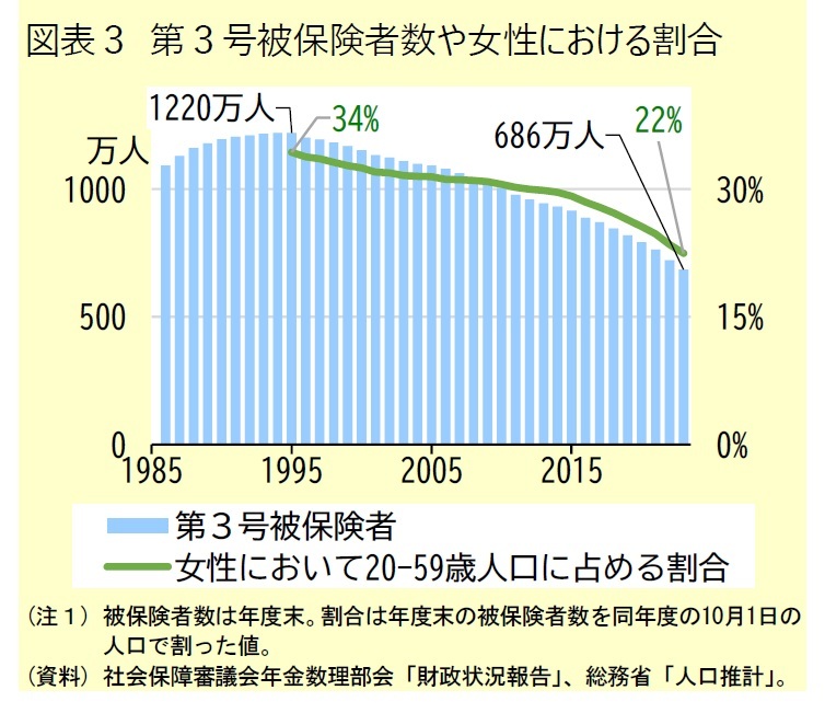女性の雇用に関する制度の改善や厚生年金の適用拡大などを背景に、第3号被保険者の人数や女性における割合は低下傾向にある(図表3)。他方で、人手不足の中で「130万円の壁」は労使双方において課題となっており、経団連や連合は、さらなる適用拡大を通じた第3号被保険者の縮小に加えて、第3号被保険者制度の将来的な再構築や廃止を求めている。この制度については直接的な保険料負担の有無が話題になりがちだが*3、今回の変更を機に労働市場への影響が注目されることを期待したい。