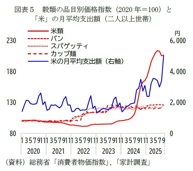 しかし、2025年8月には「米」の支出が前年の反動で大幅に減少している。米価格の上昇や需給のひっ迫を受け、政府は2025年3月下旬から備蓄米の放出を実施したものの、価格指数は依然として高止まりしている(図表5)。高価格による買い控えの影響から、名目支出は上昇しているものの、実質支出は減少傾向にある。9月には前年からの反動増で増加へと転じたが、米という日本人にとって大切な品目の支出を抑える様子からは、物価高の中で日常の基本さえも見直さざるを得ない現実もうかがえる。