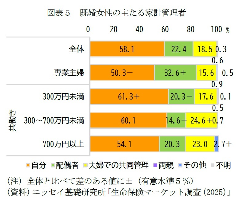 ただし、共働きの妻では年収が高いほど「自分」の割合が低下し、「夫婦での共同管理」が増える傾向がある。妻の年収300~700万円未満層で24.6%、700万円以上層で23.0%と、いずれも約4分の1を占める。つまり、高収入の妻を持つ世帯では、家計を夫婦で分担するスタイルが比較的多い。夫婦双方が高収入を得ていることで、家計の意思決定を共有し、協力して運営する姿がうかがえる。前稿で示した「妻が世帯主の世帯が約2割」という結果とも整合的である。