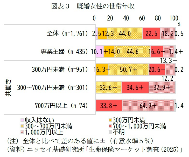 世帯年収を見ると、共働きの妻では年収が高いほど、世帯の高年収層の比率が高まる(図表3)。世帯年収700万円以上の割合は、専業主婦(30.0%)や妻の年収300万円未満層(32.8%)では全体(40.8%)を下回る一方で、妻の年収300~700万円未満層では約7割(67.5%)、パワーカップルを含む700万円以上層では98.6%にのぼる。