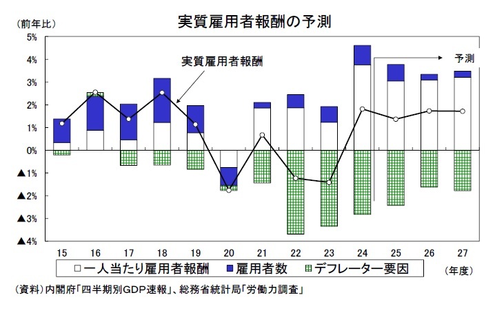 2024年度の実質雇用者報酬は、名目雇用者報酬の伸びが2023年度の前年比1.9%から同4.6%へ大きく高まったことを主因として前年比1.8%(2023年度:同▲1.4%)と3年ぶりの増加となった。名目雇用者報酬は所定内給与の伸び悩み、企業収益の回復ペース鈍化を受けた特別給与の伸び率低下から、2025年度が前年比3.8%、2026年度が同3.3%と伸びが低下した後、2027年度には春闘賃上げ率が前年を上回ることを反映し、同3.5%と伸びを高めるだろう。実質雇用者報酬は、名目雇用者報酬の伸びが消費者物価上昇率を上回り続けることから、2025年度が前年比1.4%、2026年度が同1.7%、2027年度が同1.7%と底堅く推移することが予想される。