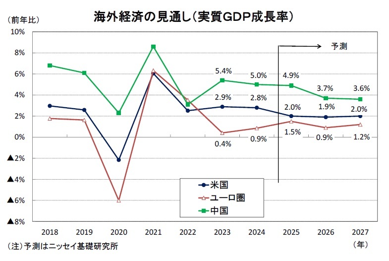 輸出の先行きを左右する海外経済を展望すると、米国は大型減税が景気を下支えするものの、関税引き上げに伴うインフレの加速が国内需要を抑制する。米国の実質GDPは2024年の2.8%から2025年が2.0%、2026年が1.9%、2027年が2.0%と潜在成長率を若干下回る成長が続くことが予想される。中国は、経済対策による下支えはあるものの、米中摩擦、不動産不況の影響で実質GDP成長率は2024年の5.0%から、2025年が4.9%、2026年が3.7%、2027年が3.6%と減速が続くだろう。ユーロ圏は防衛・インフラ関連の財政拡張措置が景気を下支えするもとで、米国の関税引き上げ前の駆け込み輸出もあり、2025年の実質GDP成長率は2024年の0.9%から1.5%へと高まるが、その影響が剥落する2026年に0.9%に減速した後、2027年には1.2%まで持ち直すことが見込まれる。総じてみれば、今回の予測期間である2027年まで海外経済の成長率は緩やかなものにとどまることを想定している。