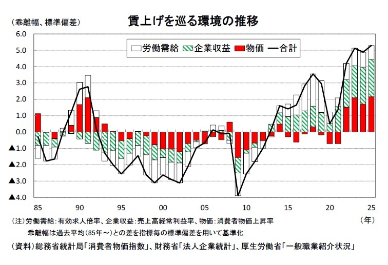 2026年の春闘を取り巻く環境を確認すると、有効求人倍率は低下傾向にあるものの引き続き1倍を上回る水準となっており、失業率が2%台半ばで推移するなど、労働需給は引き締まった状態が続いており、消費者物価上昇率は3%程度で高止まりしている。一方、企業収益はトランプ関税の影響でやや減速しているものの、法人企業統計の経常利益(季節調整値)や売上高経常利益率は高水準を維持している。賃上げの環境を過去と比較するために、労働需給(有効求人倍率)、企業収益(売上高経常利益率)、物価(消費者物価上昇率(除く生鮮食品))について、過去平均(1985年~)からの乖離幅を標準偏差で基準化してみると、3指標の合計は過去最高水準となっている。賃上げの環境は引き続き良好と判断される。