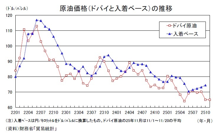 25年10月の通関(入着)ベースの原油価格は1バレル=74.4ドル(当研究所による試算値)と、8月の73.1ドルから上昇した。足もとの原油価格(ドバイ)は60ドル台半ばで推移しており、指標価格に上乗せされる調整金、船賃、保険料などを含めた通関ベースの原油価格は11月には70ドル程度まで低下することが見込まれる。
