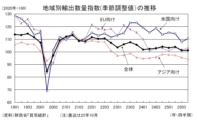 25年10月の輸出数量指数を地域別に見ると、米国向けが前年比0.0%(9月:同▲13.5%)、EU向けが前年比4.9%(9月:同▲0.2%)、アジア向けが前年比▲2.4%(9月:同3.1%)、うち中国向けが前年比▲3.3%(9月:同4.2%)となった。
