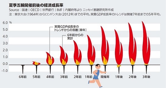 こういう話をすると、では五輪開催で経済波及効果は一体どうなってるのかという質問が出ます。これについては既に幾つかの機関が発表していて、私が知っている限りで四つか五つ出していますが、傾向は大体似ていると思っています。